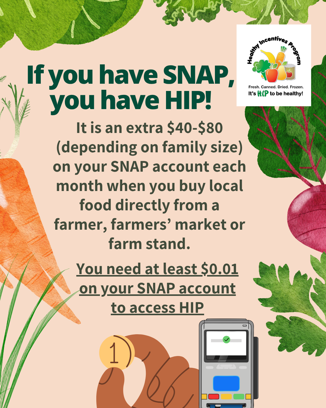 HIP (Healthy Incentives Program): HIP is managed by the state and remains fully funded and active. If you have an active EBT card, you automatically have HIP, which provides $40-$80 per month (depending on household size) to buy fruits and vegetables at this market. Balances reload at the beginning of each month. You’ll need at least one penny on your EBT card to access these funds.